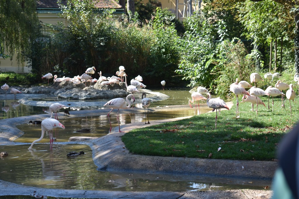 Eine ganz besondere Attraktion waren die rosa Flamingos. Sie standen um den Teich herum, oft auf einem Bein, das andere Bein war abgewinkelt.
