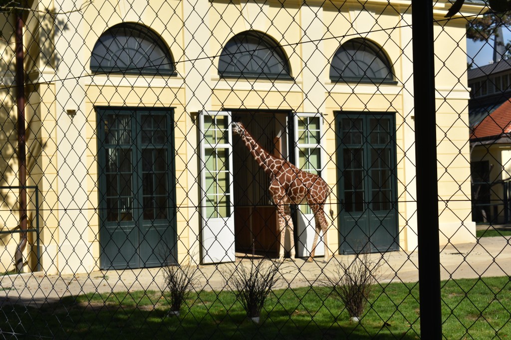 Gegenüber der Orangerie befand sich eine Koppel mit Giraffen. Diese waren hauptsächlich draußen in der Sonne anzutreffen. Es gab aber auch eine zur Koppel gehörige Halle.