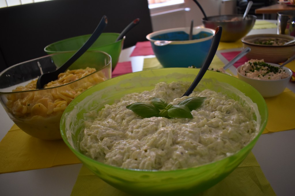 Währenddessen wurde im Sozialraum sowie im Klientinnentreffpunkt emsig das Buffet vorbereitet, um ab 12h mit der Ausspeisung zu beginnen. Es gab Frankfurter, Tsatsiki, Kartoffelsalat und einige andere selbstgemachte Saucen und Beilagen, dazu wahlweise Roggen– bzw. Fladenbrot. Zum Trinken konnten wir hausgemachten Holundersaft und Zitronade entnehmen. Wem eine Portion nicht genug war konnte ohne Probleme ein zweites Mal nachfassen.