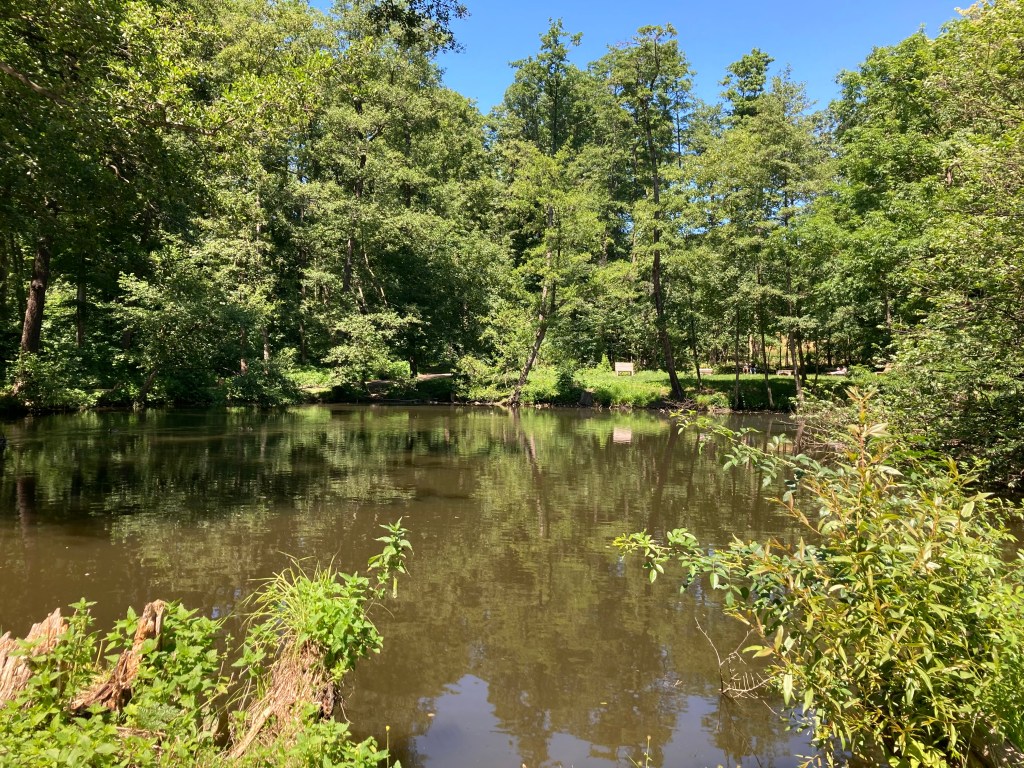 Zwischen Imbiss und Teich erstreckte sich ein langgedehnter Spielplatz, in dem wir ebenfalls eine Weile blieben und einige Gruppenfotos schossen. Am Weg erspähten wir ein Paar wundervoller Libellen, welche in türkisblauen Farben schillerten. Auch ein Gedenkmonument aus dem ersten Weltkrieg passierten wir.