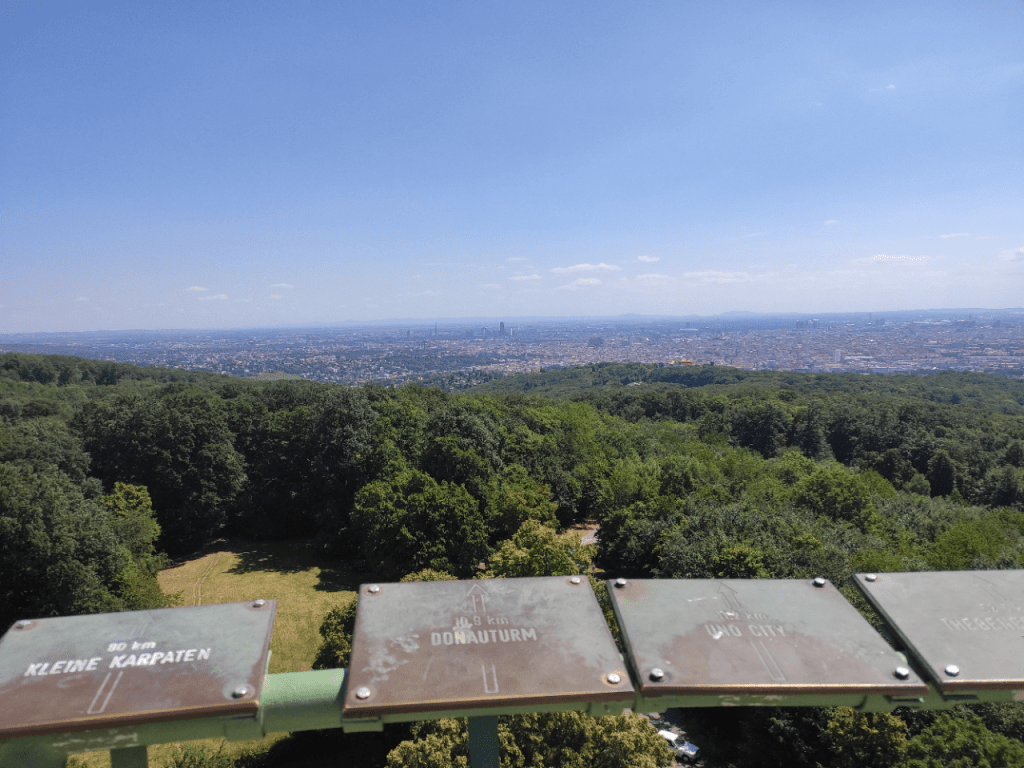 Die eine Gruppe ging links zur Lichtung, auf welcher sich zwei Holzbänke mit Tischen befanden, und packte die mitgebrachte Jause aus. Die andere Gruppe ging den Aussichtsturm hinauf, um einige Fotos von der Stadt zu schießen.