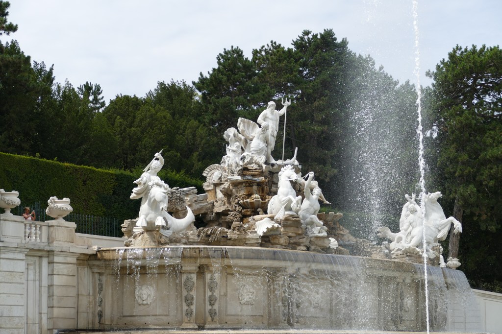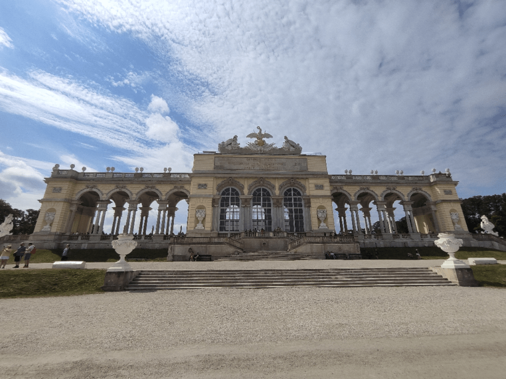 Im Schlosspark angelangt, querten wir eine große Allee, welche uns seitlich bis zur Gloriette führte. Von dort aus eröffnete sich uns ein wunderbarer Ausblick über Wien, weshalb wir innehielten und einige Fotos schossen. Es war an diesem Tag etwas bewölkt und die Sonne brannte nicht so heiß. Der Besucherstrom bei der Gloriette war überschaubar, sodass wir nicht ins Gedränge kamen. Die Gruppe machte sich auf den serpentinenförmigen Weg hinunter zu den Barockgärten.