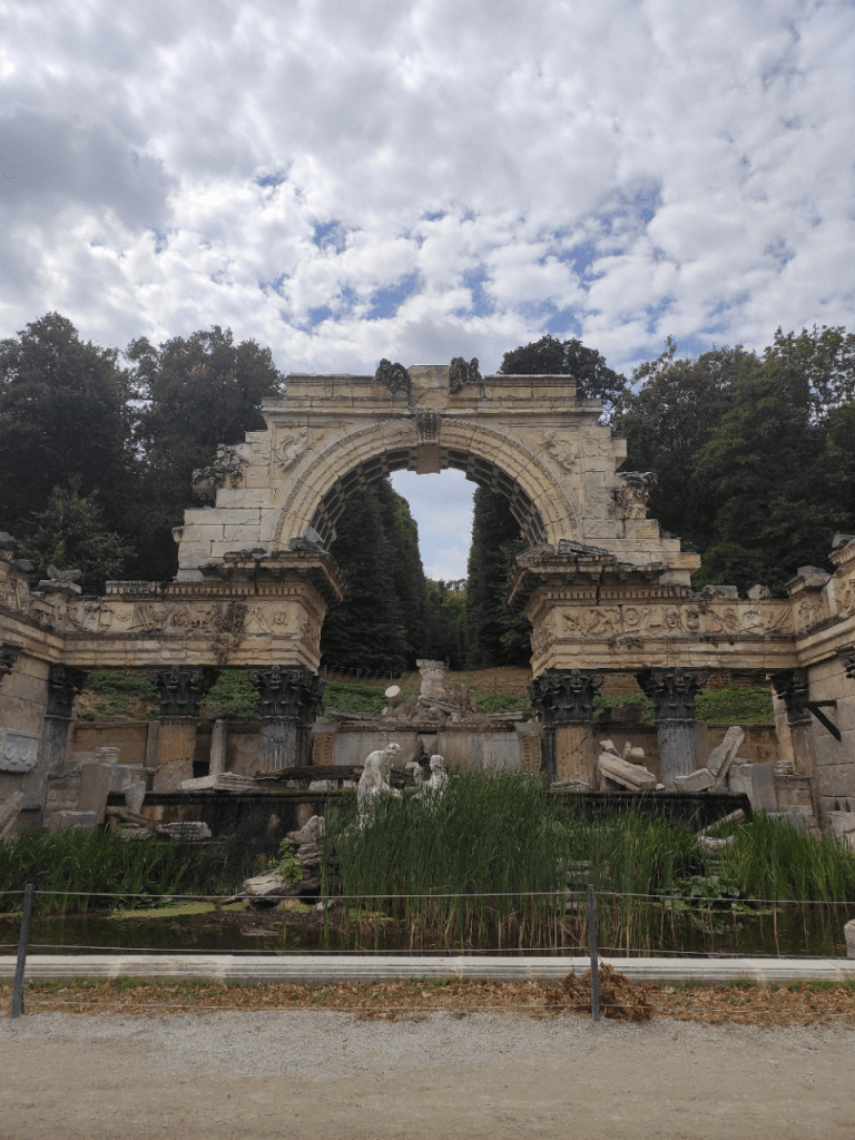 Auf der ersten Querallee nach rechts entspann sich ein Weg zur sogenannten „Römischen Ruine“, ein Gebäudefragment mit einem Torbogen durch welchen wir gezielt geplant eine weitere Statue wahrnahmen. Bei der „Römischen Ruine“ setzte sich die Gruppe auf ein paar der reichlich vorhandenen Parkbänke und rastete sich ein wenig aus.