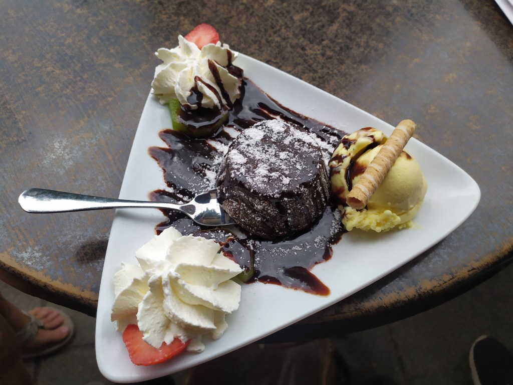 Als das Ziel schon sehr nahe war, ging die Märzstraße in einen großen Platz über, den Kardinal Rauscher Platz. An der Nummer 7 befand sich der Eissalon di Jimmy, ein Ecklokal mit gutem Ruf. Die Gruppe, bestehend aus neun Klientinnen, einem Zivildiener und zwei Betreuerinnen, stellte im Schanigarten einige Tische zusammen, sodass alle in einer Runde Platz hatten. Wir durften auf Kosten des „Handwerk“ jeweils eine Eisspezialität oder ein Getränk bestellen. Von diversen Coups über Bananensplit zu gemischtem Eis gab es eine große Auswahl. Auch ein Eiscafé durfte nicht fehlen. Wir wurden nett und zügig bedient, obwohl nicht viel Personal im Eissalon zugegen war.