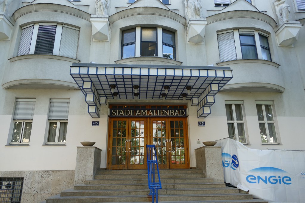 Die Gruppe bestieg den Waggon, und wir fuhren 13 Stationen (ca. eine halbe Stunde) bis Reumannplatz. Dort angekommen machten wir zunächst eine kleine Runde, an Eissalon Tichy und Amalienbad vorbei, um den Platz. Beim Amalienbad schossen wir, da es eine interessante Hauptfassade mit Skulpturen aufweist, einige Fotos. Und weiter gings, vorbei am Favoritener Arbeiterklub (Ernst Kirchweger Haus), zur Gudrunstraße. Diese bogen wir rechts ein, dann gingen wir geradeaus bis zur Sonnwendgasse, wo der Helmut Zilk Park beginnt.
