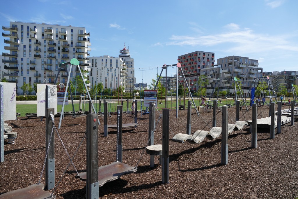 Am Weg weiter stießen wir auf den, ca. 1400m2 großen, von Kleinkinder– Kinder– und Jugendspielplatz umrahmten, sogenannten „Motorikpark“. Dieser war mit originellen Geräten bestückt und wird durch den „Verein Wiener Jugendzentren“ und die „Kinderfreunde Wien“ betreut. Wir machten eine Runde um den Motorikpark und setzten uns dann auf ein quadratisches Holzgestell, welches sich neben den geschützten Werkstätten befand. Dort legten wir eine Pause ein. Von der Ferne sah die Gruppe einen Ableger vom Hauptbahnhof.