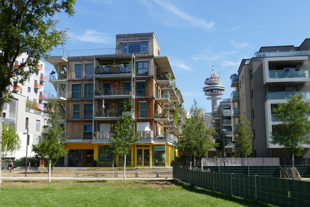 Der Park ist mit seinen 70.000 Quadratmetern der größte der letzten 40 Jahre in Wien und stellt den Löwenanteil des Sonnwendviertels dar. Wir spazierten am „Bildungscampus Sonnwendviertel“ entlang und entdeckten eine Serie von Reihenhäusern mit Balkonen und Nachbarschaftsgärten. Die Gruppe machte kurz halt bei einem Stützpunkt von Lok (Leben ohne Krankenhaus), weil dort eine Klientin der Mediengruppe betreut wird. In den Innenhöfen machten wir wieder einige Fotos zur Dokumentation.
