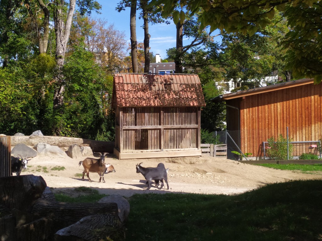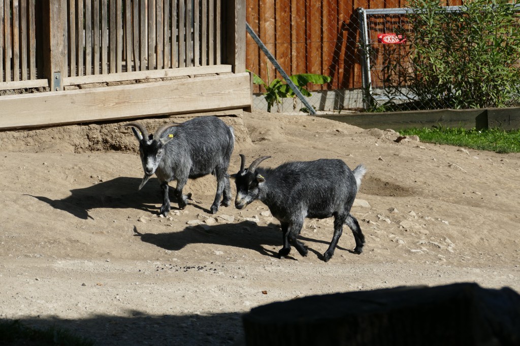 Nach Umrundung der großen Futterwiese eröffnete sich uns die letzte Attraktion des hiesigen Tages, eine Koppel mit Ziegen. Diese waren erstaunlicherweise ziemlich zutraulich und kamen bis zum begrenzenden Holzgatter des Geheges, wo sie sich ebenfalls fotografieren ließen. Im Gehege gab es einen Stall, in welchen sich die Tiere bei Schlechtwetter zurückziehen konnten. Das Nachmachen der Ziegenlaute war sehr amüsant.