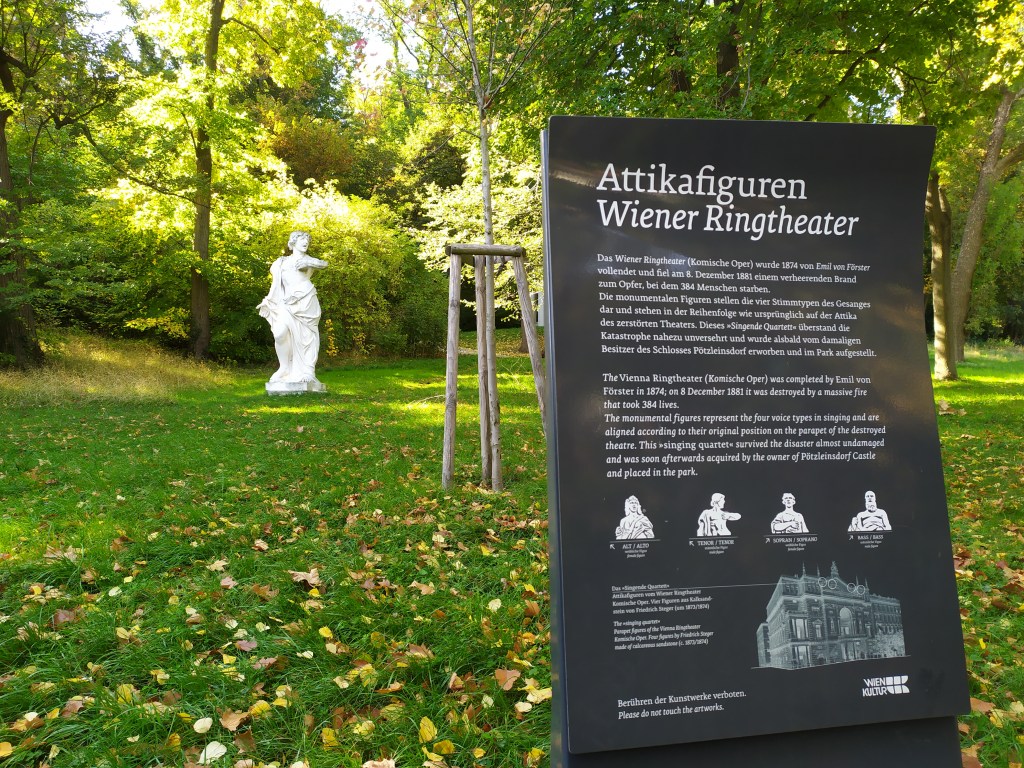Im Park drinnen gewahrten wir einen Kindergarten und eine Volksschule nach dem Montessori – Prinzip. Die Kinder spielten ausgelassen auf einer Wiese vor dem Schulgebäude, welche extra eingezäunt war. Die Gruppe ging schnurstracks weiter und kam an riesengroßen alten Mammutbäumen vorbei, an welchen wir einige Fotos schossen. An der Seite befanden sich vier Attika – Figuren, welche eine Allegorie auf die vier Stimmlagen (Alt, Sopran, Tenor, Bass) darstellen.