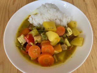 Gemüse waschen, putzen, schälen und in bissgroße Stücke schneiden. Öl in einem Topf erwärmen. Zwiebel glasig anrösten, danach Currypulver und Chiliflocken dazugeben und die Aromen entfalten lassen. Tofu, Karotten und Kartoffeln dazu geben. Kurz anrösten lassen. Restliches Gemüse hinzufügen. Mit der Brühe aufgießen und mit Salz und Pfeffer würzen. Für etwa 30 Minuten auf kleiner Stufe köcheln lassen und zwischendurch immer wieder umrühren. Sobald die Kartoffeln weich genug sind und das Curry eine sämige Konsistenz aufweist, die Kokosmilch hinzufügen. Nochmals kurz köcheln lassen. Als Beilage passt dazu: Basmatireis oder Jasminreis.