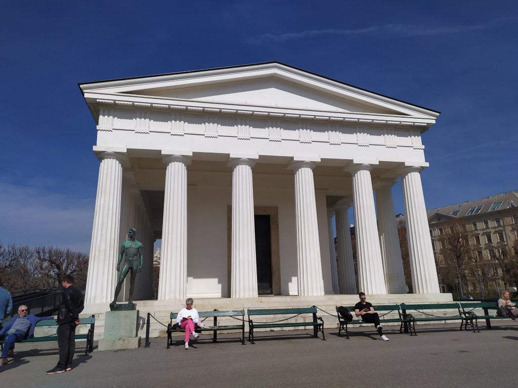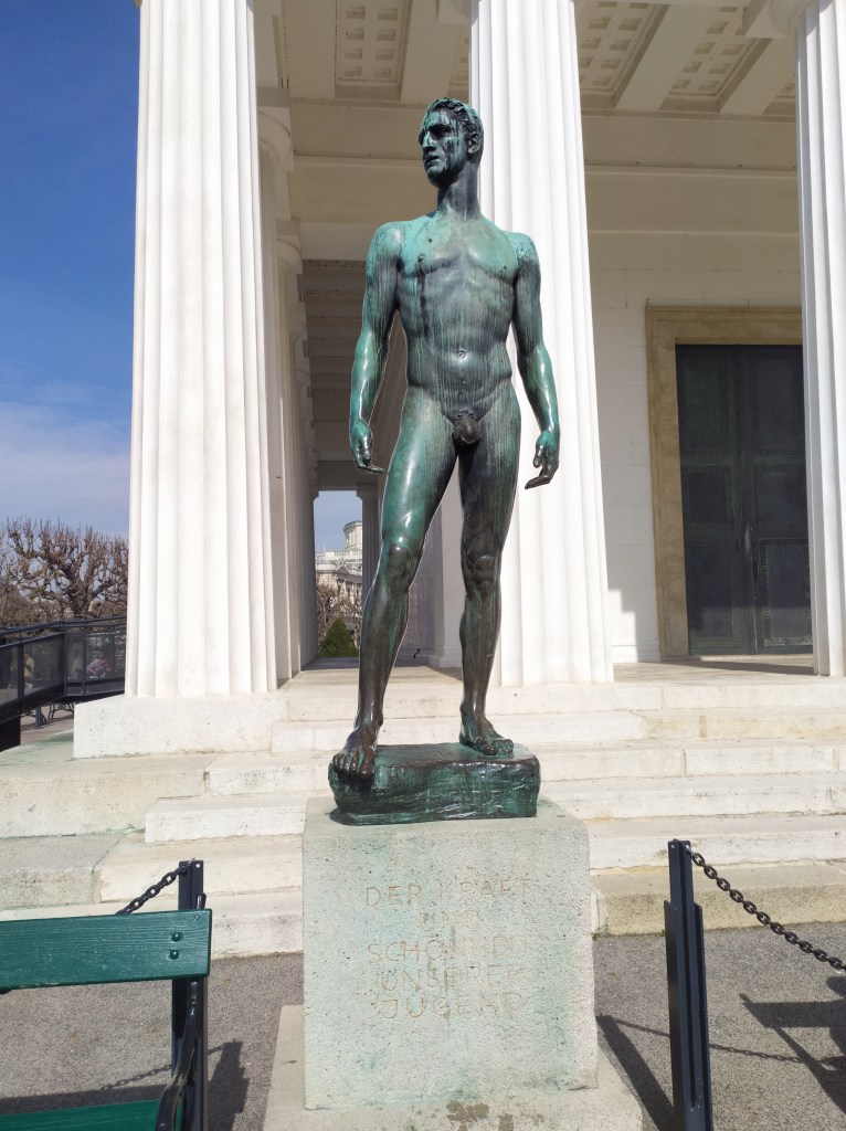 Zwischen den Beeten und dem Eingang befindet sich der Theseustempel, welchen wir als nächste Station besuchten. Das Pantheon war von antiken Säulengängen umrahmt, vor dem Eingang ragte die Bronzestatue eines Jünglings in die Höhe. Der Tafel neben dem Jüngling konnten wir Informationen über den Künstler und die Geschichte der Statue entnehmen. Mit dem Handy fotografierten wir den Tempel und die Statue, um uns anschließend auf den umgebenden Bänken auszurasten. Das Wetter war angenehm, sodass wir noch einige Zeit draußen in der Sonne verbrachten.