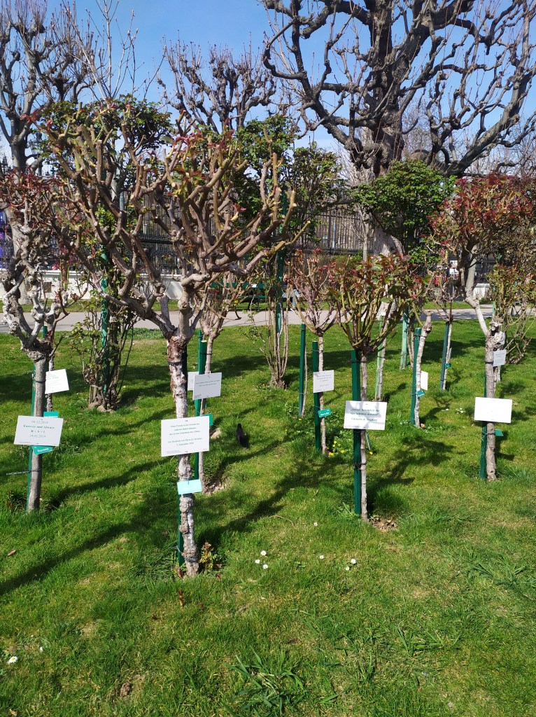 Es war ein lauer Vormittag mit leichter Bewölkung, und so flanierten wir zu den Pflanzenbeeten, welche ziemlich flächendeckend mit persönlichen Widmungen versehen waren. Die Gruppe zog eine komplette Runde durch die Wege entlang der Botanik, die Parkbänke an den Seiten waren fast alle besetzt. Die Gäste genossen die Vormittagssonne, die sich in immer größeren Intervallen zeigte.
