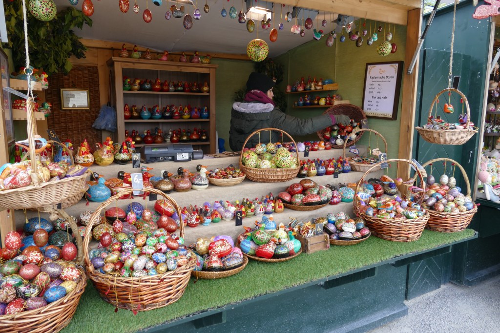 Gleich in der Nähe des Eingangs begannen die Stände des Ostermarktes. Es empfingen uns eine bunte Mischung aus liebevoll gestaltetem Kunsthandwerk. Von Keramik über Holzschnitzereien zur Glasbläserei erstreckte sich das Sortiment der Stände, die oft auch originell benannt waren. An der einen Ecke des Marktes befand sich eine „Osterhasenwerkstatt“, in welcher die interessierten Gäste selbst Ostereier bemalen konnten. Sie war recht gut besucht. Wir flanierten an verschiedenen, auch kulinarischen, Ständen vorbei und kamen an das links obere Ende des Marktes, an dem ein lebensgroßes Osterei, von einem bemalten Holzgatter umzäunt, in die Höhe ragte. Bei diesem Osterei schoss die Gruppe einige Fotos, ein Klient hatte eine eigene Kamera mit und bereicherte unsere Sammlung mit vielen schönen Bildern.