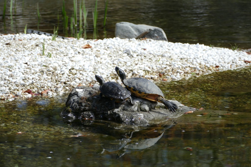 Doch wie wir sogleich sahen konnte das Paradies schon irdischer Natur sein. Durch den Bambus Eingang vorbei am Stein „Furomo“, welcher ein mythologisches Zeichen zum Eintritt ins Paradies darstellt, kamen wir zu einem original japanischen Teehaus. Es befand sich an einem See, in welchen das gesamte Wasserspiel des Parks mündete. An der gegenüberliegenden Seite des Sees entfaltete sich die wundervolle Pracht der japanischen Kirschblüte, von der es laut Meinung eines Kollegen zehn verschiedene Sorten gibt, wovon die „Somei Yoshino“ im Ausland am meisten verbreitet ist. Im See selbst tummelten sich einige Schildkröten, welche wir fotografierten.