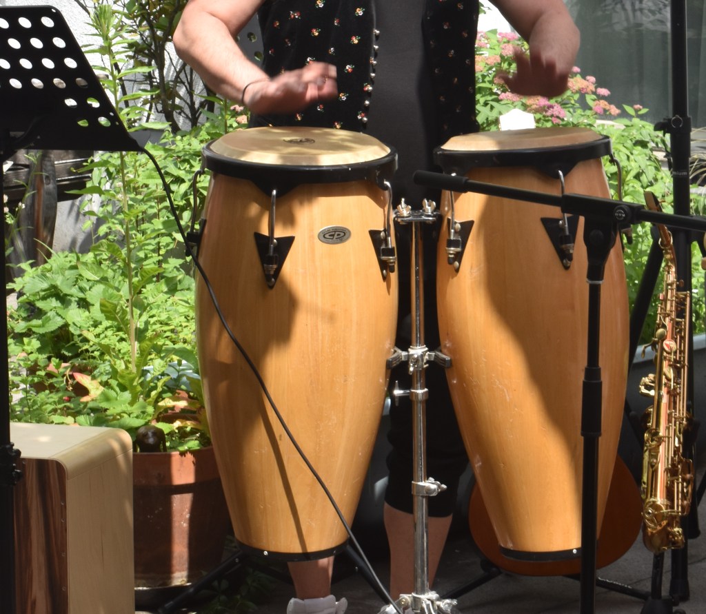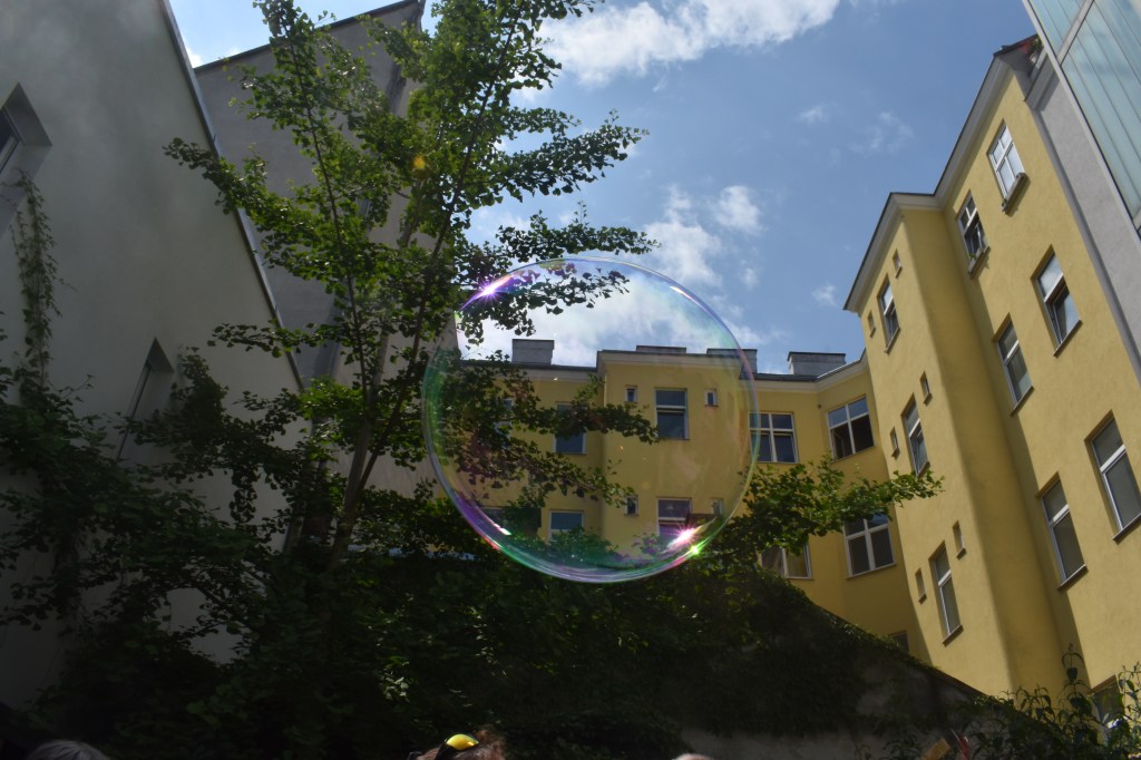 Gefolgt wurde dieser Act von der Performance dreier Coverversionen, vorgetragen von Harry und Nicole (Medien – und Theatergruppe). Ein Teil der MMM Allstars beteiligte sich mit Perkussion an dieser Vorführung. Die Stimmung im Hof war großartig, es wurde viel geklatscht und gesungen. Die Betreuer:innen und die Praktikantin filmten und fotografierten den Event. Barbara gab ein wunderschönes Gedicht zum Besten und Sunny rappte drei eigene Texte. Der Rap beschloss gleichsam den ersten Teil des Programms.