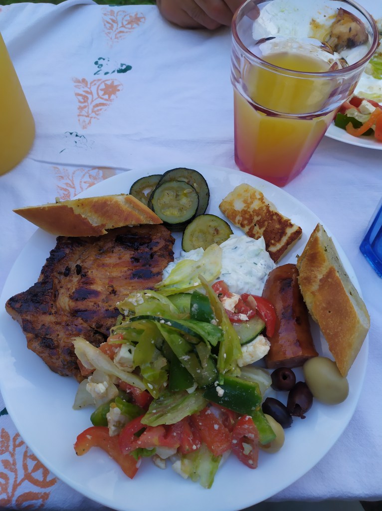 Die Gruppe schoss einige Fotos von der Tafel, einige mit und einige ohne Gäste. Bei den Salaten waren noch Oliven und Babymais extra dabei. Nachdem das Grillen auf beiden Platten abgeschlossen war, entnahm die ganze Gruppe ihre erste Portion zum Essen. Die selbstgemachten Speisen konnten mit Cocktailsauce, Knoblauchsauce oder BBQ – Sauce verfeinert werden. Die Mischung schmeckte den Teilnehmer:innen ausgezeichnet! Da die erste Portion den Leuten so gemundet hatte, schöpften die meisten noch eine zweite Portion nach, solange der Vorrat reichte. Als Getränke waren Orangensaft, Apfelsaft und Hugo – Limonade aufgetischt.