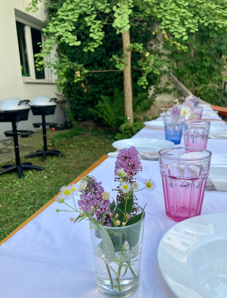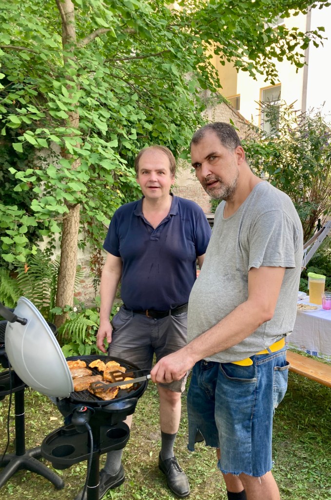Die Vorbereitungen im Hof begannen mit dem Organisieren eines Verlängerungskabels für die Stromversorgung der Griller. Wir schlossen die Griller im großen Speisesaal an. Anschließend wurden zwei große Heurigentische für die Tafel zu zwölf Teilnehmer:innen (neun Klient:innen und drei Betreuer:innen) sowie vier Heurigenbänke vom Keller herangekarrt. Für die Salate (Tsatsiki, Mayonaisesalat und griechischer Bauernsalat) sowie das Grillgut wurde ein eigener Tisch neben die beiden Grillplatten gestellt.