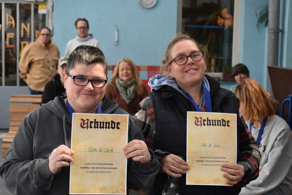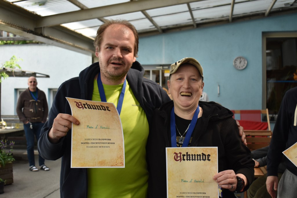 Am Mittwoch, dem 24. April, am Nachmittag und am Donnerstag, dem 25. April 2024, am Vormittag fand im Hof des HandWerk ein Doppeltischtennisturnier statt. Ersteres war für die Nachmittagsgruppen bestimmt, das Zweite für die Vormittagsgruppen. Beim Donnerstagtermin gab es einen Split in eine Anfänger– und eine Profigruppe.