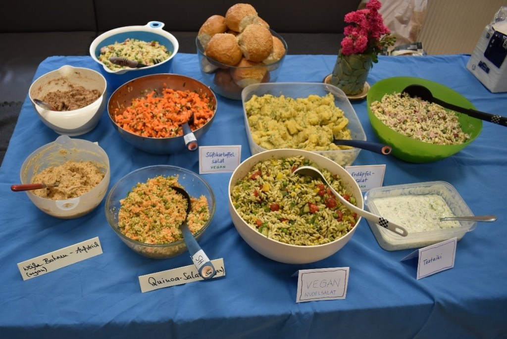 Für das Mittagessen stellten wir uns vor den Klient*innen-Stützpunkt im Erdgeschoss an. Es gab zur Selbstbedienung Aufstriche (Liptauer, Eiaufstrich, Hummus, …), vegan oder nichtvegan, Debreziner und Frankfurter sowie vegane Würstel. Auch eine Reihe von Salaten (Tsatsiki, Nudelsalat, Kartoffelsalat, …) durfte nicht fehlen. Am letzten Tisch vor dem Ausgang konnten wir noch Ketchup, Barbecuesauce, Mayonnaise, … entnehmen. Für die Nachspeise lagen noch selbstgemachte Kuchen und Apfelstrudel bereit.