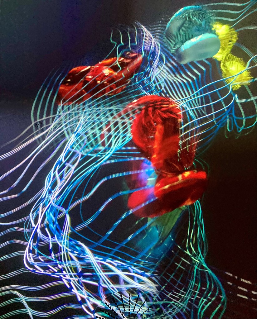 Nach den Bildschirmen folgten wir dem Weg durch den Gang weiter zu einem Saal, in dem gefüllte Matratzen aufgelegt waren. Dieser gehörte zu einem Soundexperiment, bei welchem die Besucher*innen liegend ihre eigenen Kreationen anhören konnten. Diese Kreationen hießen Clongs und wurden im Nebenraum durch eine virtuelle Komposition erzeugt (siehe Foto links; Erstellung der Clongs mit Virtual Reality Brille). Zu jedem Clong gab es eine grafische Darstellung, mit welcher wir die Clongs zuordnen konnten.