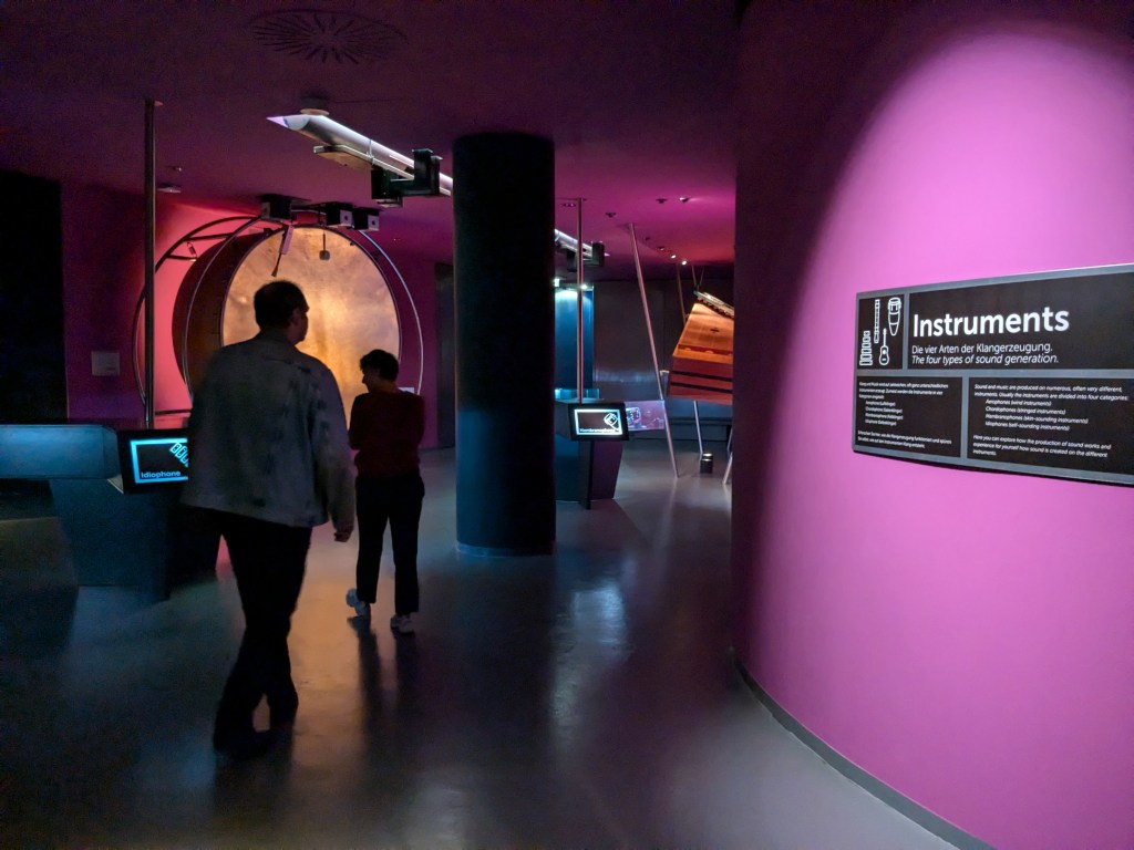 Wir fuhren mit dem Aufzug zunächst in den 1. Stock, wo uns eine Ausstellung über die Wiener Philharmoniker erwartete. Diese wurden Mitte des 19. Jahrhunderts von Otto Nikolai gegründet und halten sich bis heute. In einem separaten Kinosaal sahen wir das aktuelle Neujahrskonzert. Im Rahmen der Ausstellung gab es die Möglichkeit mit einem virtuellen Würfel und vier virtuellen Instrumenten einen Walzer zu komponieren. Die erzeugten Melodien konnten sich anhören lassen! Wir hatten weiters die Möglichkeit, im Eingangsfoyer einen Tonträger der erzeugten Melodie abzuholen, eine Option, welche wir in der Regel aber nicht in Anspruch nahmen. Im Stiegenhaus des ersten Stockwerks war eine spezielle Treppe angebracht, welche beim Draufsteigen chromatische (jede Stufe stellte einen Halbton dar) Klaviertöne spielte. Diese Attraktion war sehr originell.