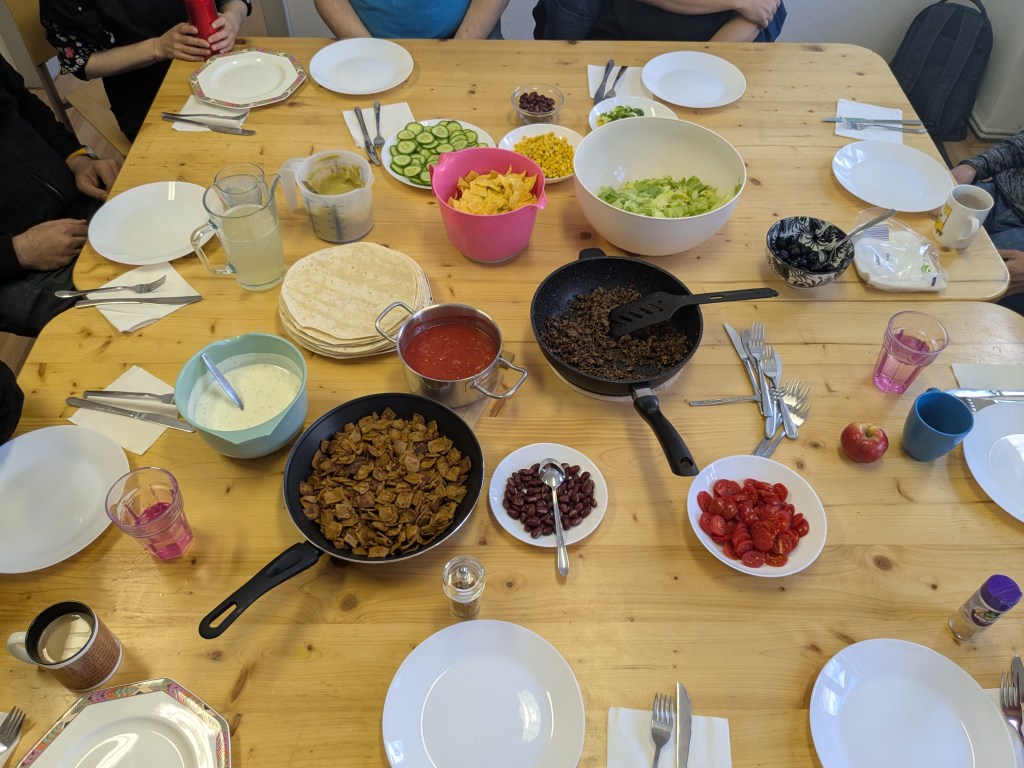 Für diejenigen, welche keine Wraps zu sich nahmen, gab es Tortilla – Chips zur Auswahl. Das Selberkochen ließ bei uns eine beträchtliche Vorfreude auf die anschließende Mahlzeit aufkommen. Als die Vorbereitung fast abgeschlossen war, deckten wir den Tisch mit Tellern und Besteck für die Klient:innen und Betreuer:innen. Die feierliche Handlung der eigentlichen Wrap- Bestückung leiteten wir mit dem Schießen einiger Fotos vom gedeckten Tisch ein.