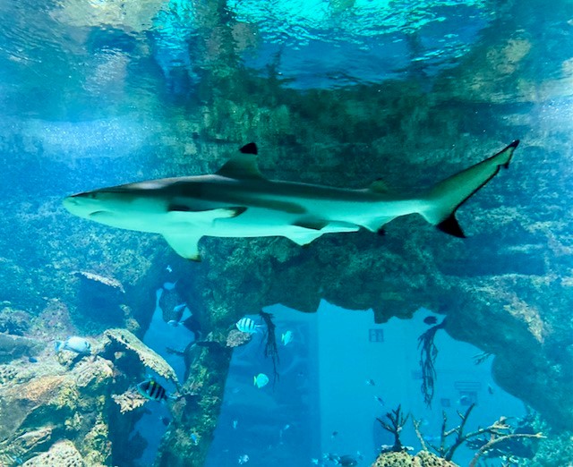 In Ebene 7 besuchte die Gruppe das sogenannte „Neuguinea–Paludarium“, eine Mischung aus Aquarium und Terrarium. Wir sahen riesige Baumpythons, die aufgerollt auf den Bäumen lagen. Der Wasserteil beherbergte viele bunte Regenbogenfische, welche aufgrund ihrer Farbenpracht beliebte Aquarienfische sind. Weiter ging es zum „Wüsten–Terrarium“. Dort leben die ursprünglich aus den USA und Mexico stammenden „Gila–Monster“, Krustenechsen, welche neben dem Komodowaran die einzigen giftigen Echsen unter den Reptilien darstellen. Im selben Terrarium befindet sich die sogenannte „Colorado–Kröte“, die zur Feindabwehr ein Hautsekret über ihre Giftdrüsen absondert. Im gleichen Stockwerk befand sich noch das „Pacific Eye“ sowie das 360º Haibecken. Das „Pacific Eye“ ist ein Bullauge, welches durch die Krümmung der „Linse“ einen detaillierten Blick auf die Tierwelt mit Schwellhaien, etc. ermöglicht. Das 360º Haibecken stellt ein Oval dar und ist rundum begehbar.