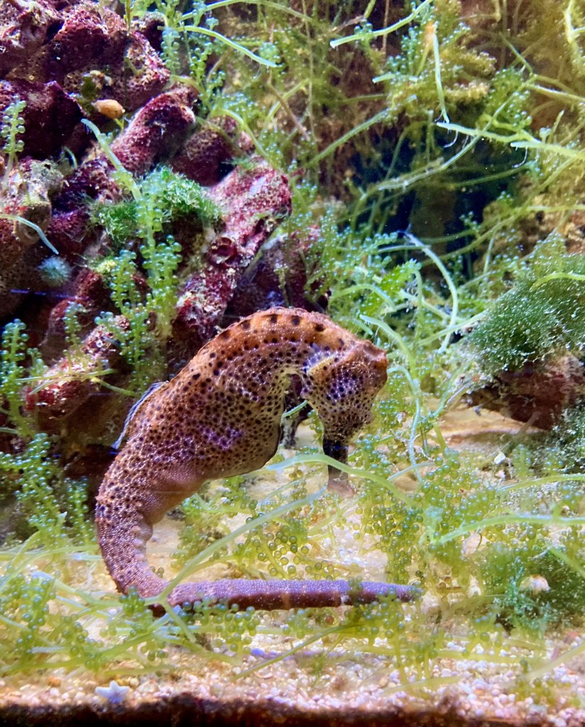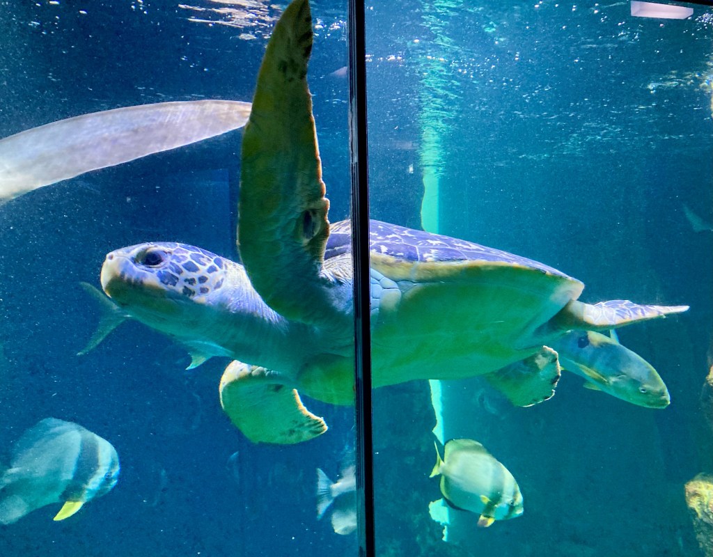Wir gingen hinunter zu Ebene 6, wo uns das „Stör–Aquarium“ sowie die Meeresschutzausstellung „Wir und das Meer“ erwartete. Störe gelten als eine der am stärksten bedrohten Tiergruppen weltweit. Lebensraumverlust, blockierte Wanderrouten und illegale Fischerei für den Konsum von Kaviar machen ihnen zu schaffen. Bei „Wir und das Meer“ konnten wir in die Unterwasserwelt eintauchen, es wurden Meeresnutzung und Meeresverschmutzung dokumentiert. Ebenfalls auf Ebene 6 befand sich die Pflegestation des Blauen Kreises, eine Art Tierheim für beschlagnahmte und ausgesetzte Reptilien.