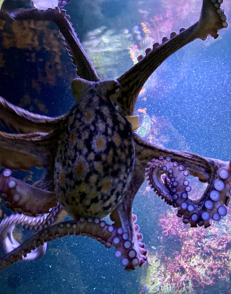 In der Ebene 2 befanden sich gleich neben dem „Krokipark“ Aqua–Terra–Galerien im Südstiegenhaus, welche sich über drei Ebenen erstrecken. Auf der untersten Ebene befinden sich ganz besondere Amphibien, nämlich die sogenannten Titicaca–Frösche, den beliebten Axolotl und seinen „Vetter“, den noch stärker vom Aussterben bedrohten Achoque. Auch die Kalksinterterassen, ein Süßwasseraquarium, in welchem sich Fische aus der Ägäis und im Nahen Osten finden lassen, konnten wir sehen. Eine im Jahre 2025 gebaute Süßwasseranlage unseren Besuch von Ebene 2.