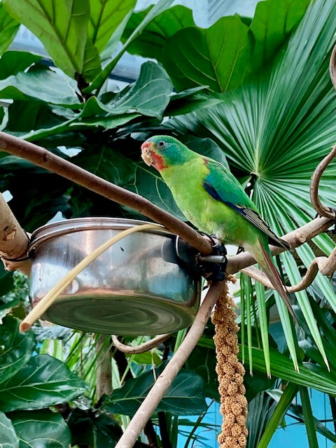In Ebene 4 besichtigten wir die Ausläufer des „Puppi–Aquariums“, welche sich über zwei Ebenen erstreckt. Es gab weiters einen Zugang zum „Tropenhaus“, eine sehr stilvoll begrünte Anlage, welche auf 200m2 Grundfläche und 15m Höhe weit über 100 Arten ein zuhause bietet. Die Holztreppen und Lianen waren sehr authentisch und eine Freude zum Begehen. Das Tropenhaus umfasst Bereiche bis auf Ebene 2 und ist von Ebene 2 auch erreichbar. Genau vis à vis des „Puppi–Beckens“ befand sich das „Café Sharky“, welches einen herrlichen Blick auf den Park und die Stadt bot. Ein wunderbarer Platz zum Verweilen!